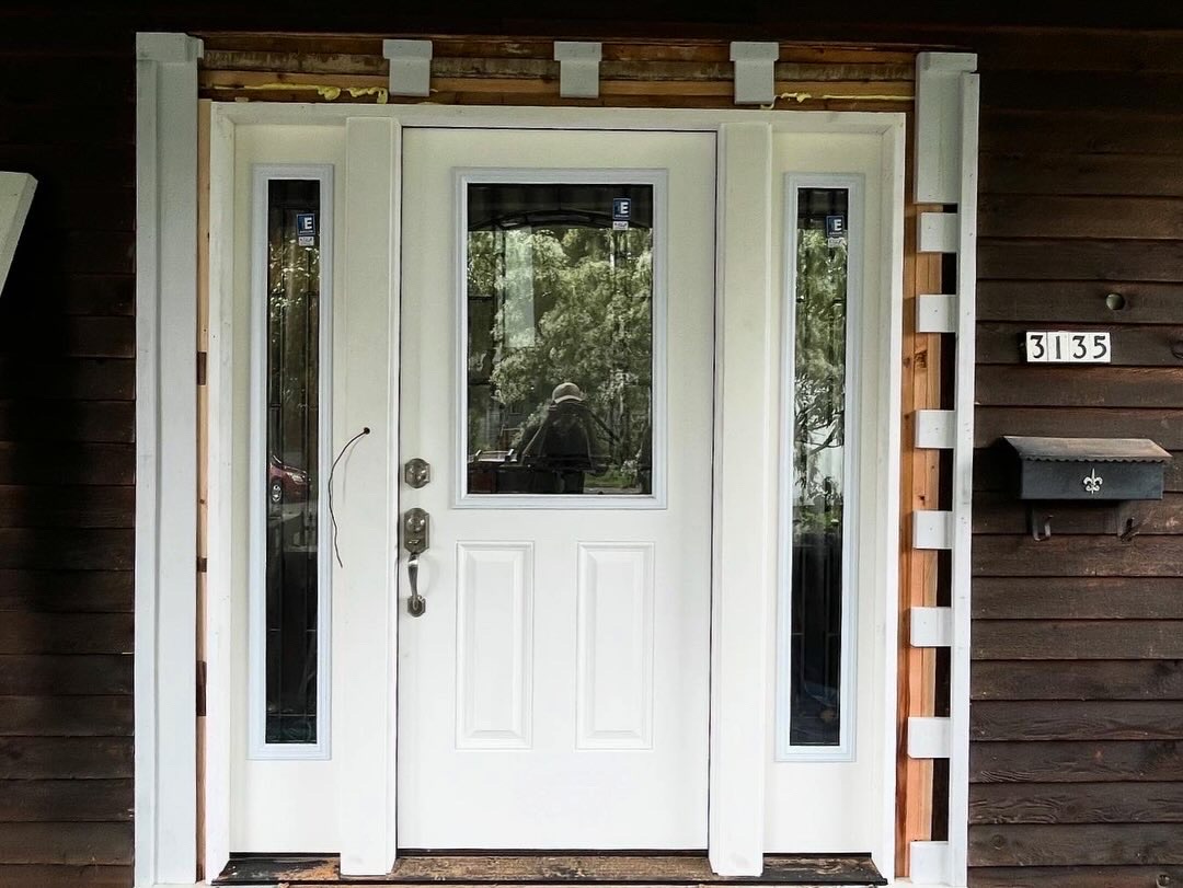 Older Portland homes often reveal unexpected surprises once the trim comes off, and this Hosford-Abernethy project was no exception. The existing front door measured 74” wide, but once the surrounding material was removed, the true rough opening measured 79”. The new door the client selected was only available at 69”, and the wall itself was more than an inch out of plumb from exterior to interior.